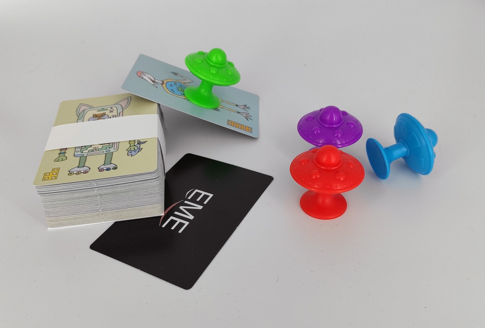 W zestawie znajdują się: instrukcja, 4 silikonowe statki, 80 kart z kosmitami i pseudowyrazami (na rewersach) do czytania. Karty zostały podzielone kolorystycznie na 4 poziomy trudności.