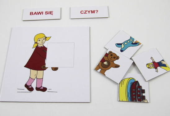 Zestaw ten służy do nauki dopasowywania małych elementów do całości, dopasowywania rzeczownika w odpowiedniej formie do obrazka, odpowiedzi na pytania: Czym się bawi?, przez podanie etykietek lub wypowiedź oraz czytanie wyrazem.