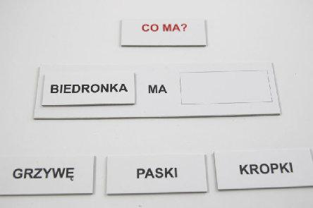 Zestawy te służą do nauki dopasowywania elementów w postaci schematu do obrazka, odpowiedzi obrazkiem lub etykietką na pytania np.: Co ma słoń? Kto ma trąbę? (Jaki ma kolor?) i nauki zdań (układania ich) zawierających pewną informację. Osiągamy tu też czytanie pełnymi wyrazami (czytanie globalne) i pełnymi zdaniami.