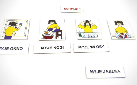 Zestaw ten słuzy do nauki odnajdywania na obrazku sytuacji przedstawionych w rzeczywistości, imitowania czynności mycia określonych części ciała lub przedmiotów na podstawie obrazka - rozumienie pytania: Co myje?, oraz udzielania odpowiedzi obrazkiem, etykietką lub słowem, do nauki czytania globalnego (całymi wyrazami), zapamiętywania zdania dwuwyrazowego.