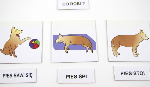 Zestaw ten służy do nauki umiejętności określania czynności zwierząt, przyswajaniu zdań dwuwyrazowych, zwracania uwagi na drugi wyraz w zdaniu przy czytaniu pełnymi wyrazami (czytanie globalne) oraz rozumienia pytania: Co robi....?