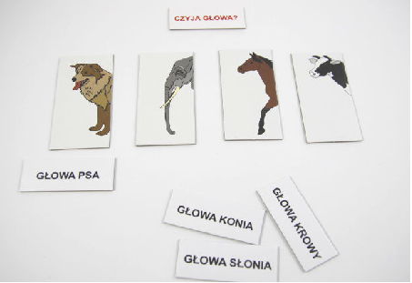 Zestaw ten służy do nauki rozróżniania elementów części ciała zwierząt (głowa,ogon) - rozumienia pytań: Czyj?. Umiejętności identyfikowania zwierząt według głowy,ogona oraz udzielania odpowiedzi obrazkiem, etykietką lub słowem, do nauki czytania globalnego (całymi wyrazami), zapamiętywania wyrażenia dwuwyrazowego.