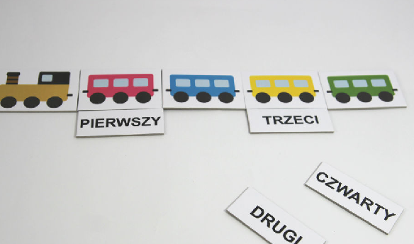 Zestaw ten służy do wprowadzenia nazw liczebników porządkowych w połączeniu ze znajomościa kolorów oraz nauki odpowiedzi na pytanie: Który z kolei ?, formy językowe z końcówkami –a, –e, –y (pierwsza, pierwsze, pierwszy) ocenianie liczebności zbioru na podstawie liczebnika porządkowego, ustawienie w szereg.