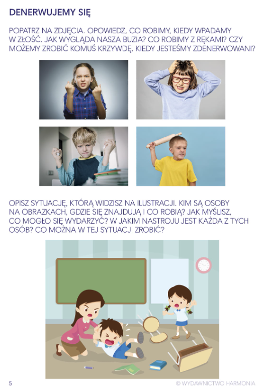 Publikacja przeznaczona jest dla dzieci z problemami emocjonalnymi, a także problemami z zachowaniem i wyrażaniem oraz nazywaniem emocji. Karty pracy zawierają zarówno zadania, dzięki którym uczeń może na podstawie tekstu lub ilustracji opowiedzieć o cechach charakteru, stanach emocjonalnych, przeanalizować różne sytuacje społeczne, jak i takie, podczas wykonywania których aktywność dziecka polega na rysowaniu, kolorowaniu, wycinaniu oraz wklejaniu.