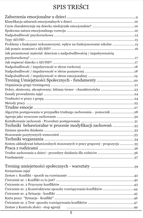 W publikacji znajdziecie Państwo miarodajną, opartą na wieloletnim doświadczeniu klinicznym prezentację zajęć TUS dla dzieci w wieku 10 - 14 lat. Przewodnik obejmuje wskazówki do realizacji treningu, którego celem jest zmiana zachowań niepożądanych, trudnych, konfliktowych na akceptowane społecznie. Znajdziecie w nim Państwo fundamentalne informacje o tym, jak pracować z uczniami nadpobudliwymi, zagrożonymi niedostosowaniem społecznym, jak realizować proces modyfikacji behawioralnych, jak organizować grupę treningową. W publikacji przedstawione są zasady prowadzenia zajęć TUS, praktyczne wskazówki jak radzić sobie z trudnościami i oporem w grupie, a także jak pracować z rodzicami dzieci, które uczestniczą w treningu TUS.