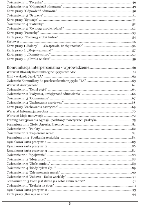 Ćwiczenia TUS i TZA ART. oraz liczne karty pracy zamieszczone w Przewodniku obejmują wskazówki dotyczące realizacji krok po kroku takich zagadnień jak konflikt, złość, radzenie sobie z trudnymi emocjami, agresją, budowanie zespołu, budowanie samoświadomości i motywacji do zmiany zachowania.